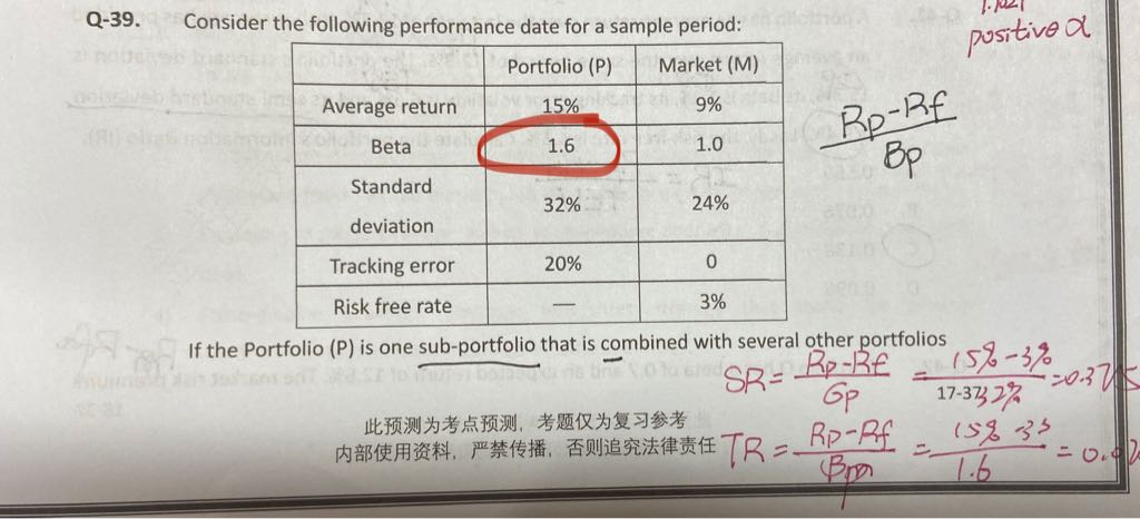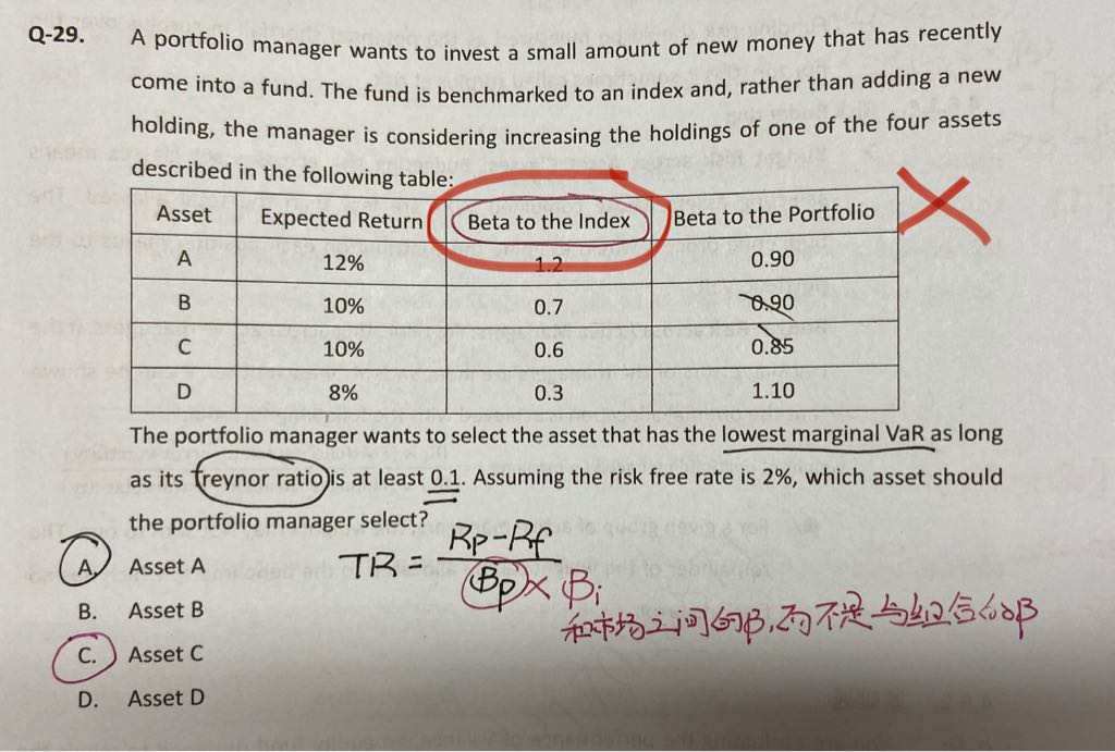 老师好,请问特雷诺指数的分母到底是组合的贝塔还是组合和市场之间的贝塔?这两题分别来自百题的29/39题,第29题分母处用的是Beta to the index,也就是和市场之间的贝塔,和第39题bu