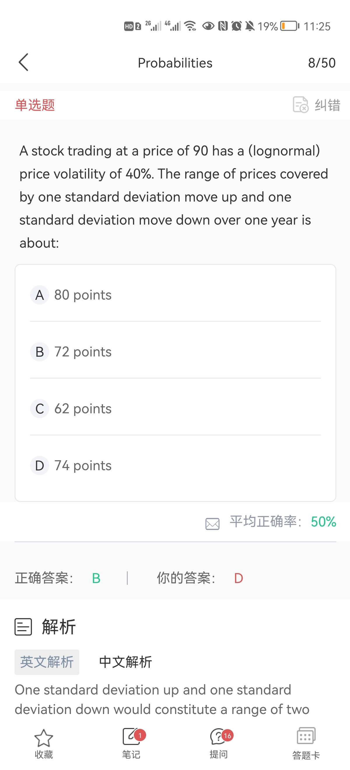 已回答这题服从lognormal, ln90会落在正态分布内,ln90+0.4=4.8998.映射回去134.26,ln90-0.4=4.0998,对应价格60.32,134.26-60.32=73.93,选74,这样有什么问题?