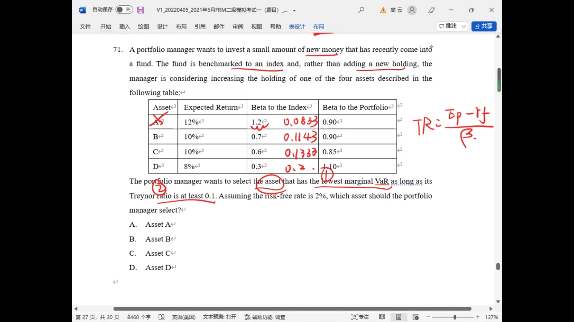 老师,算treynor ratio时,为什么不用最后一列的beta?