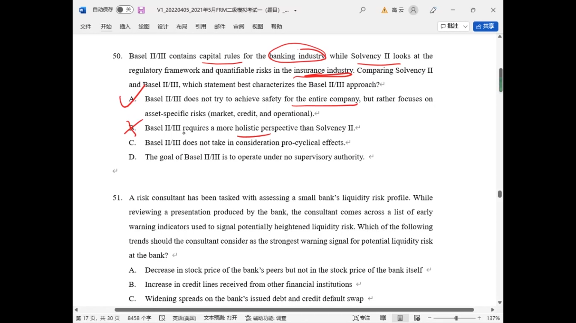 选项B,老师解释巴塞尔准则不是完整的视角,只是分别考虑信用、市场、操作风险,所以错了。可选项B的表述是说巴塞尔准则与solvency ||相比视角更完整,这个表述对吗?老师解释的貌似跟B项无关啊?