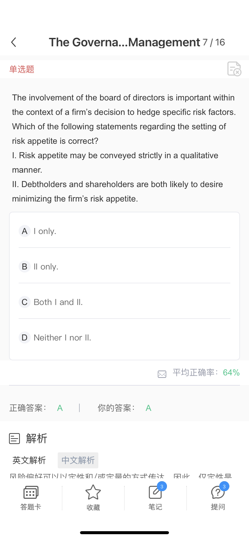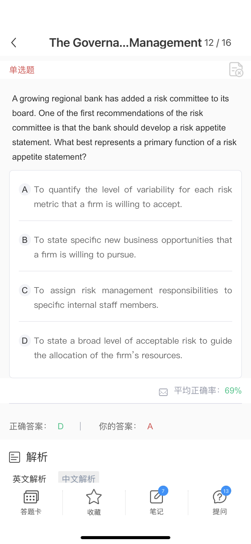 第一题说了risk appetite 可以量化传达 和定性传达 所以仅定性 或定量没有问题啊 这种题太有争议了吧