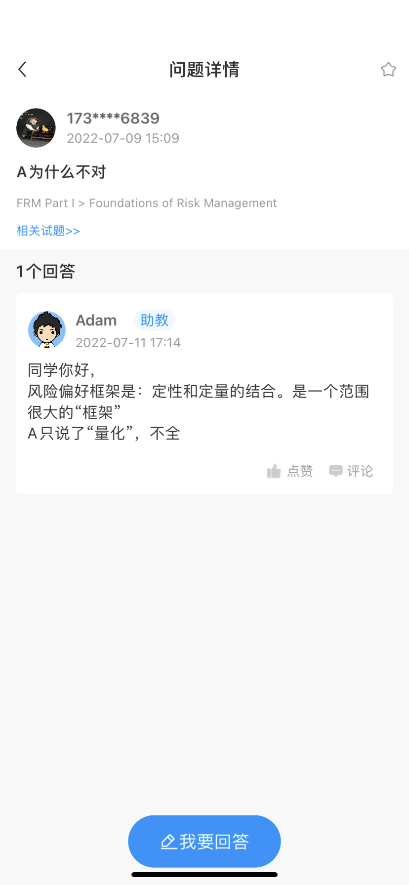 FRM问答包含在线课程、FMR通关课程、FRM试题等所有FRM相关问题,每个问题老师均会在24小时内给出答疑回复哦!