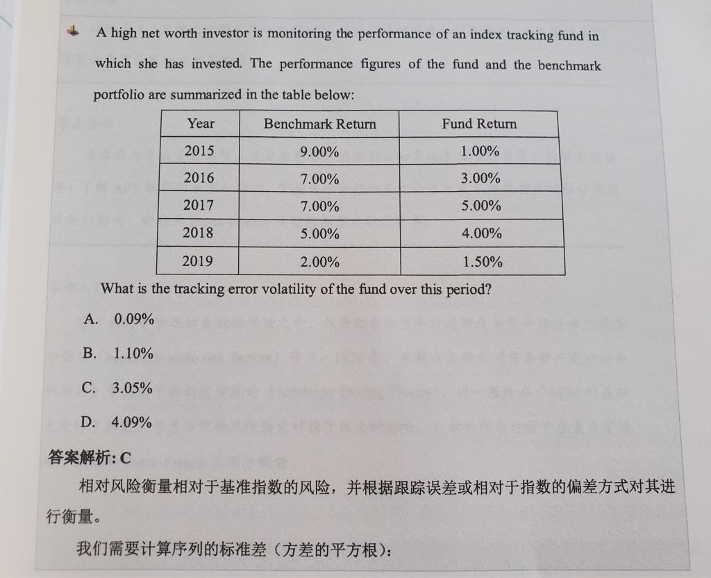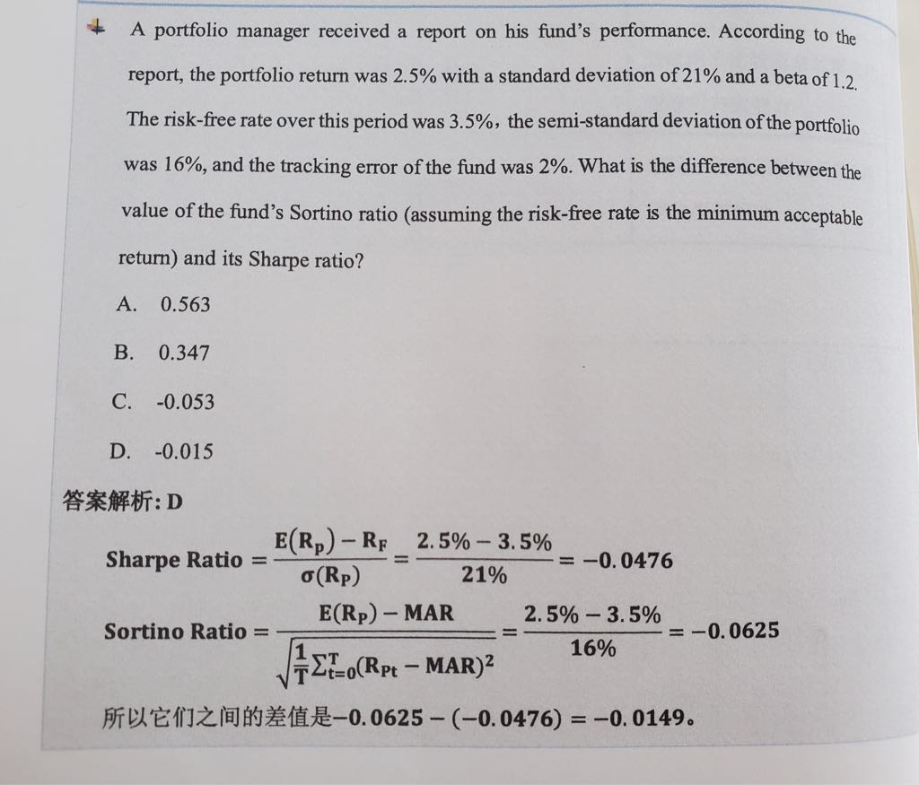 老师请看下这个题,首先只考虑本金或者久期,那么如题所述的rate升高对减少NP对吗?var的部分呢,是不变吗,如果这么理解A和B选项应该是对的。D选项undiversified是零时刻现值乘以对应var,那么rate变大折现因子也会变小,如果var不变D选项也是变小。希望您做一下这个题之外还能回答我,1:不明白每个时刻对应的var和利率有关吗?用参数法应该考虑是债券P/L的均值和波动对吗?那债券的P/L和rate是有关系的,上面就不能说r↑,NP变小,var不变。2:这个题答案说是C,但是也不一定对,因为是很久前互相传过来的。想问的是考虑了相关性,是用到这个ρ*Zα*σ算边际var,再近似得到的componentVar么,这么算var看起来是没有变化的,但是NP也还是受利率↑而下降。如果您觉得没有正确答案就请回答我提出来的后面两个问题吧,感谢。