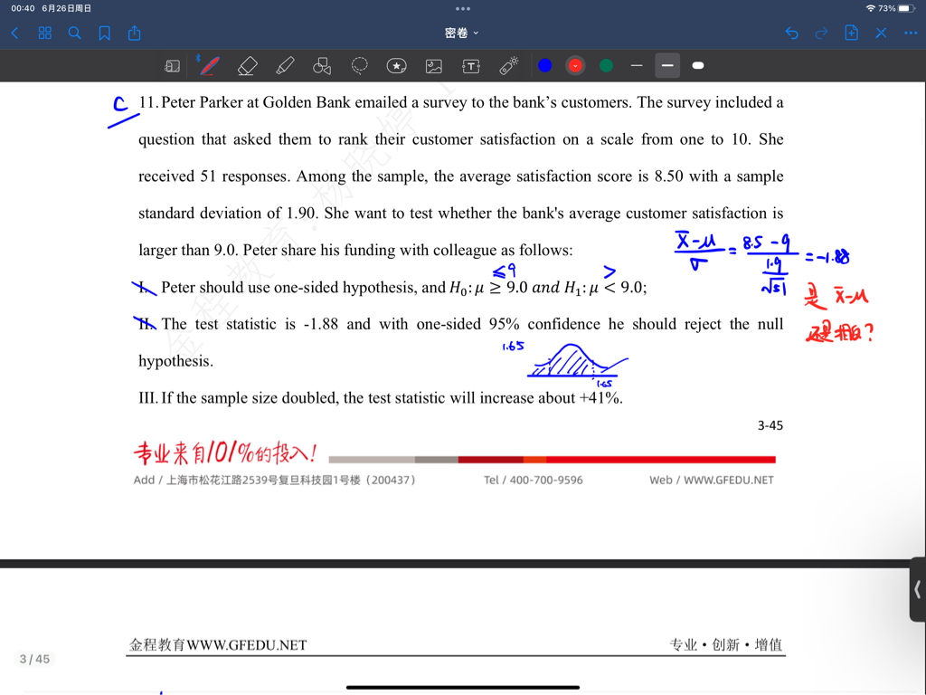 这道题2,3为什么对?为什么要用1.88的绝对值与关键值比较,它不是单尾的么,-1.88注定小于+1.65啊。此外,如果样本变多,它负数的越多,应该是越小啊