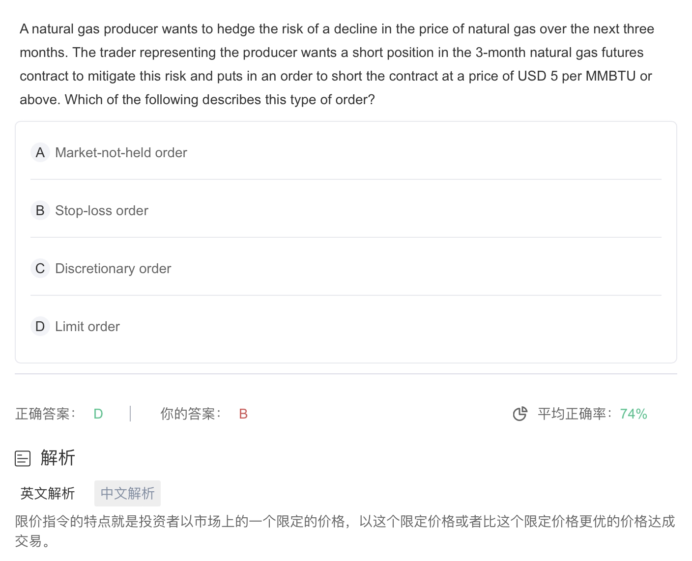 这道题能讲解一下吗?卖空行为,如果油价如果涨到5块就是亏的,stop loss有啥问题吗?为啥是limit呢?如果是5块的limit指令,后续对应什么动作?