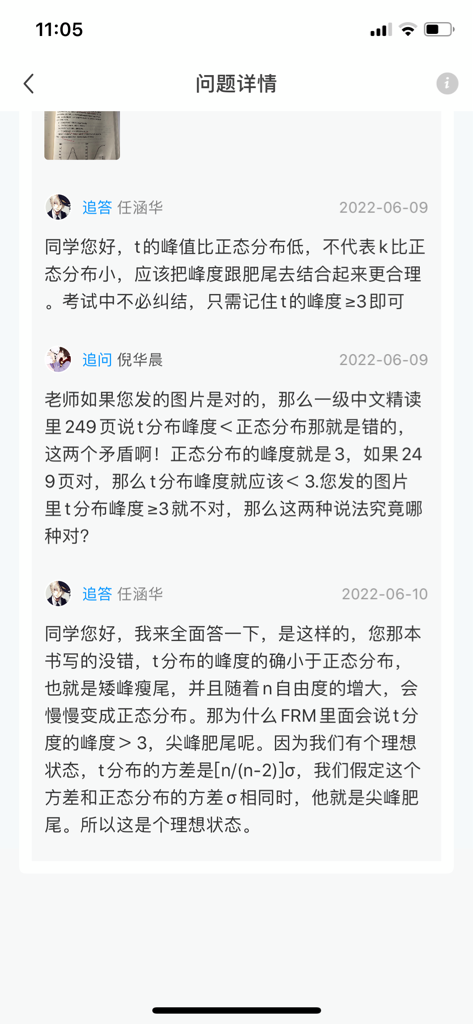 老师我知道t分布是肥尾的,理想情况下尖峰,但是我也知道说它是矮峰也是对的,那么考试我应该按照t分布尖峰还是矮峰答题呢?考试会给前提是理想条件还是正常情况么