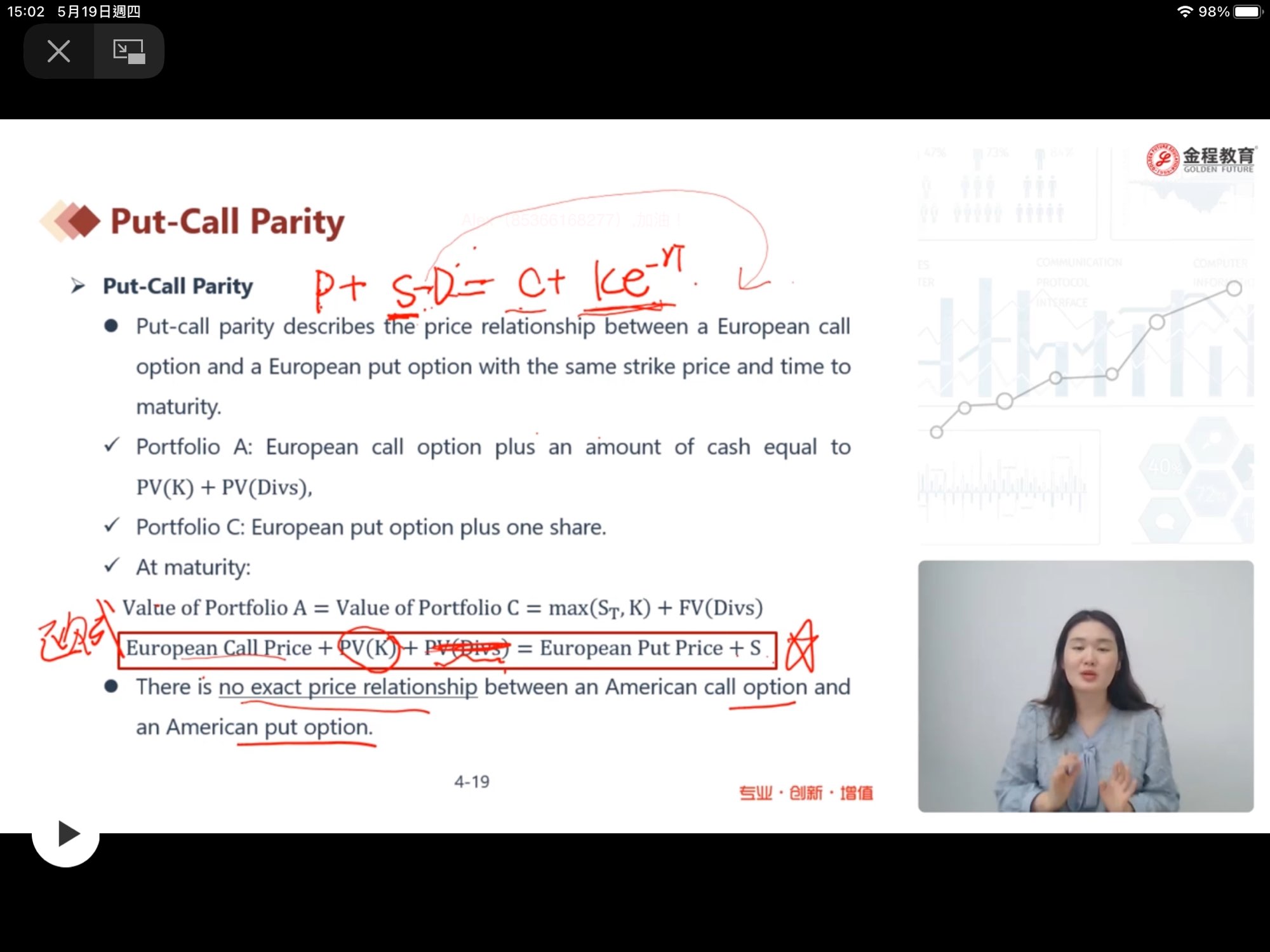 老師,如果這裏是有dividend是不是P+S=C+Ke^-rt+De^-rt這樣理解?