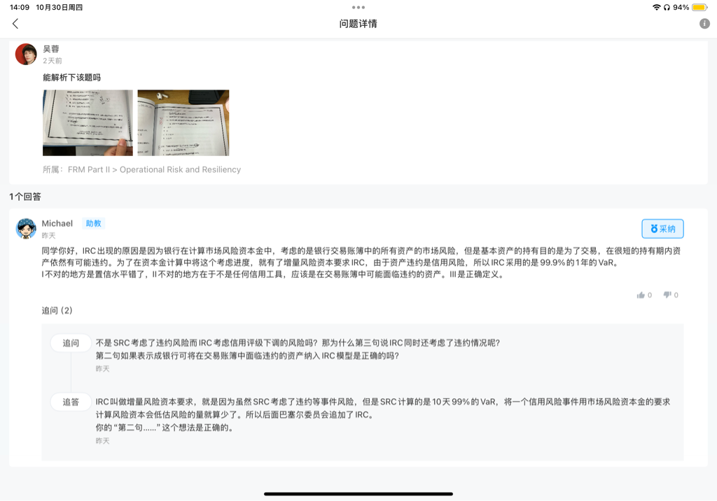 FRM问答包含在线课程、FMR通关课程、FRM试题等所有FRM相关问题,每个问题老师均会在24小时内给出答疑回复哦!