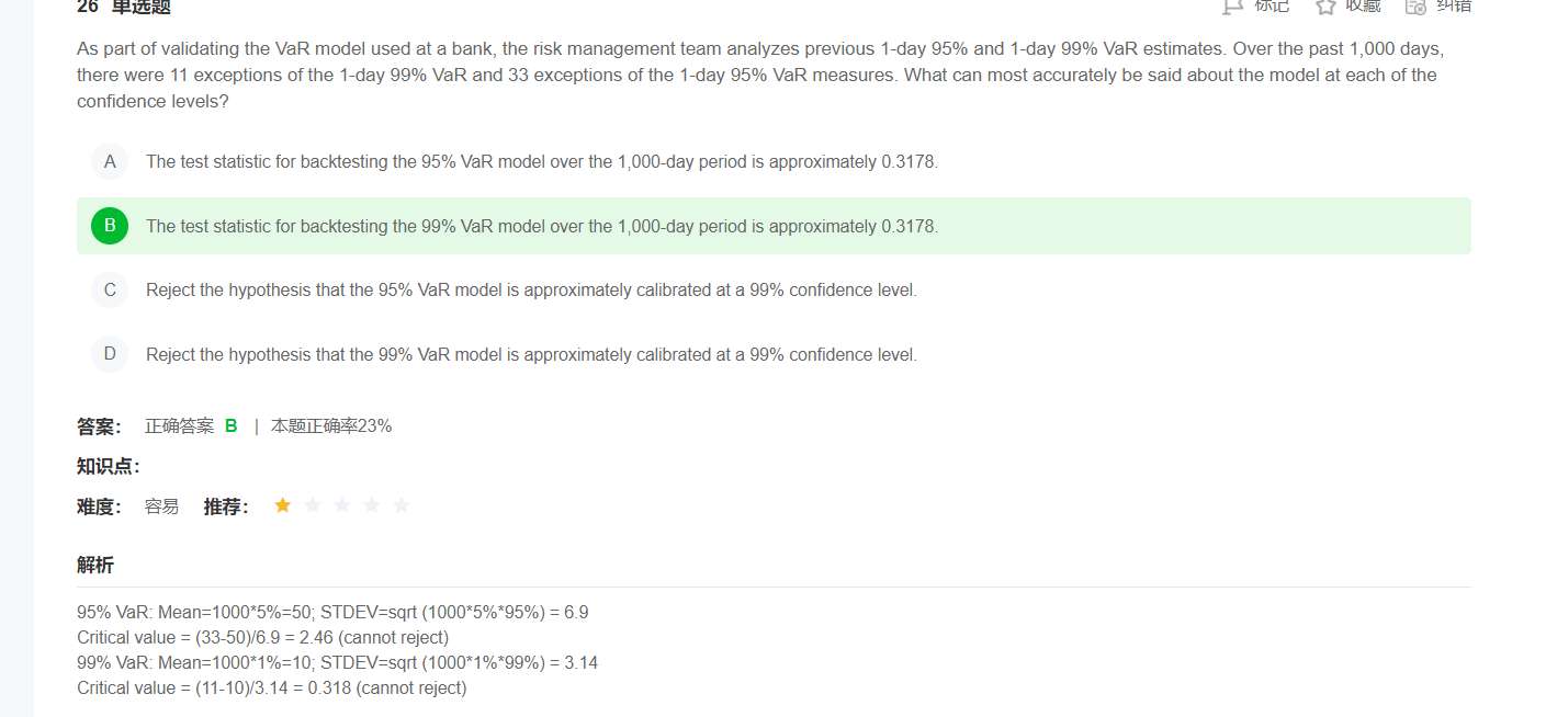 95% VaR: Mean=1000*5%=50; STDEV=sqrt (1000*5%*95%) = 6.9 Critical value = (33-50)/6.9 = 2.46 >1.96双尾的关键值,为什么cannot reject?