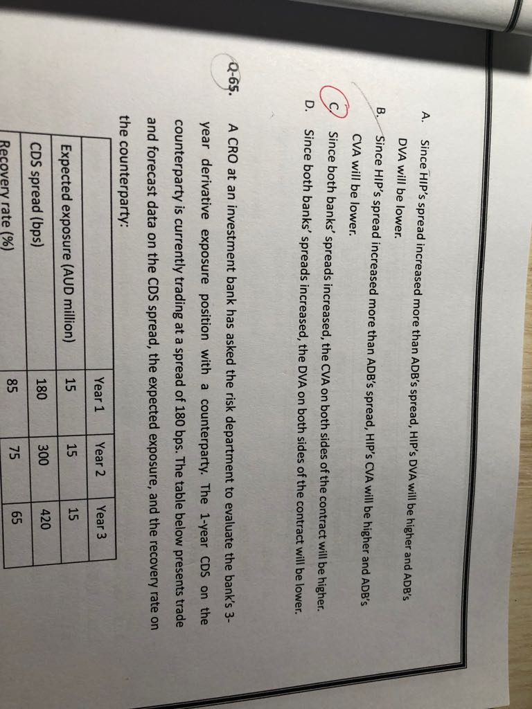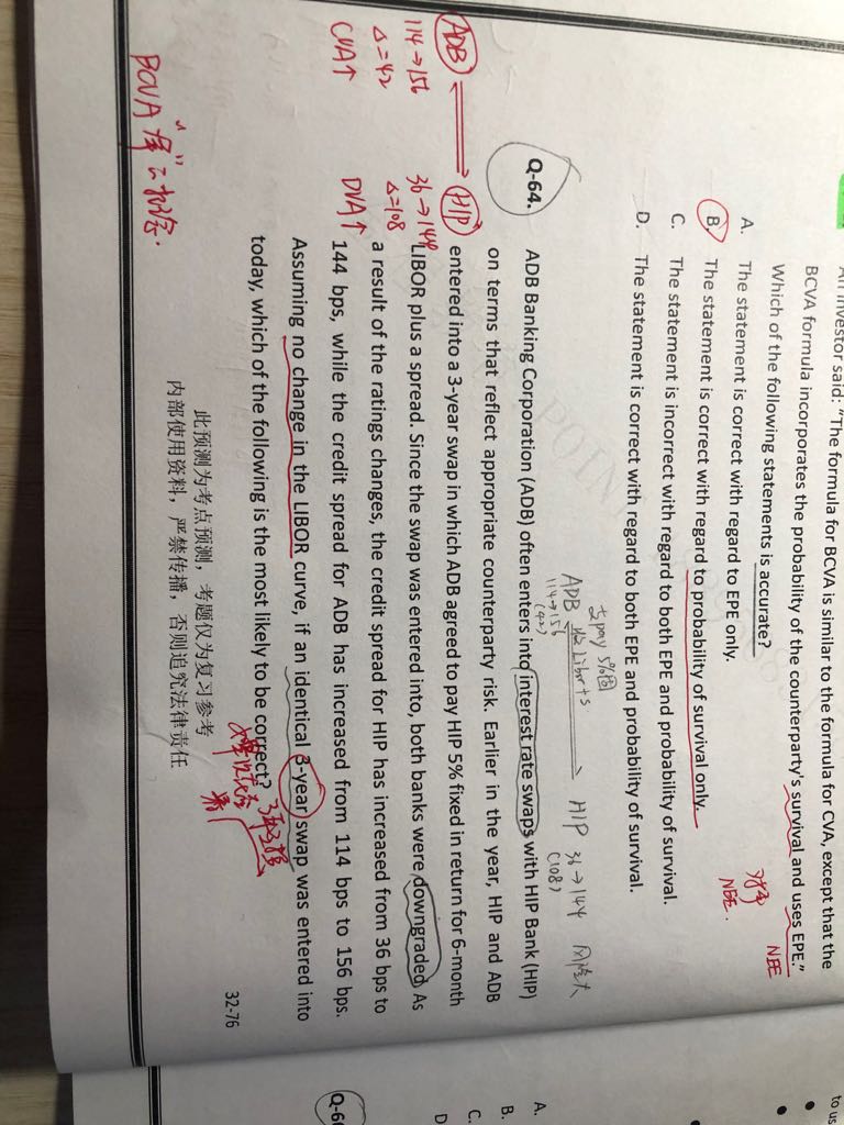 老师 这道题目b为什么不对 对于ADB是算CVA 也就是他的对手应该给他的风险补偿 应该是多的 因为 HIP的cs上升高于ADB的cs HIP的DVA也是上涨的 因为 ADB的cs也上涨了