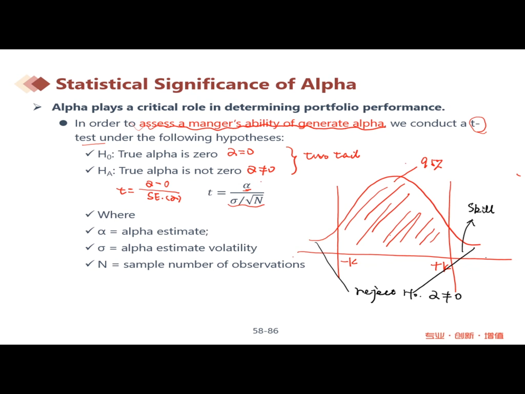 这里的T 检验是如何判定接受还是拒绝?不应该是落在左右尾巴处都是拒绝原假设的吗