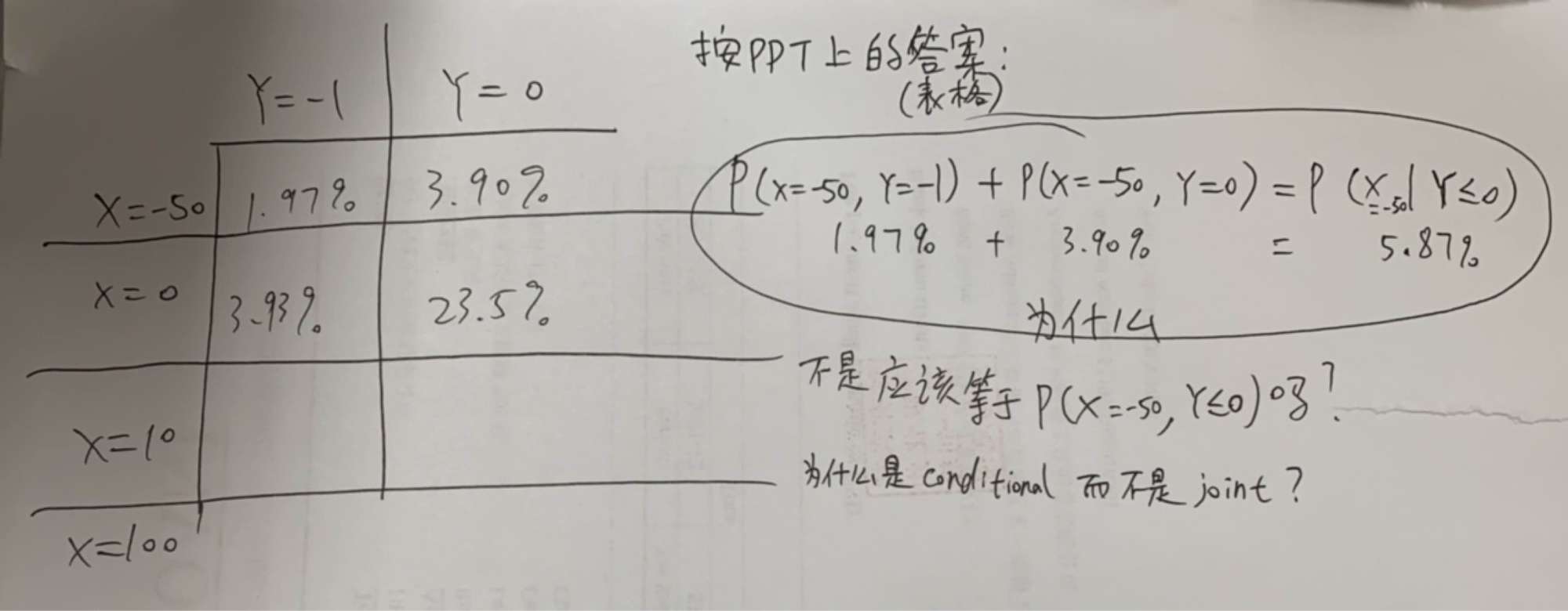 视频01:22:01位置的Q1(d),为什么可以这样横向相加之后得出conditional?为什么得出的不是joint prob?