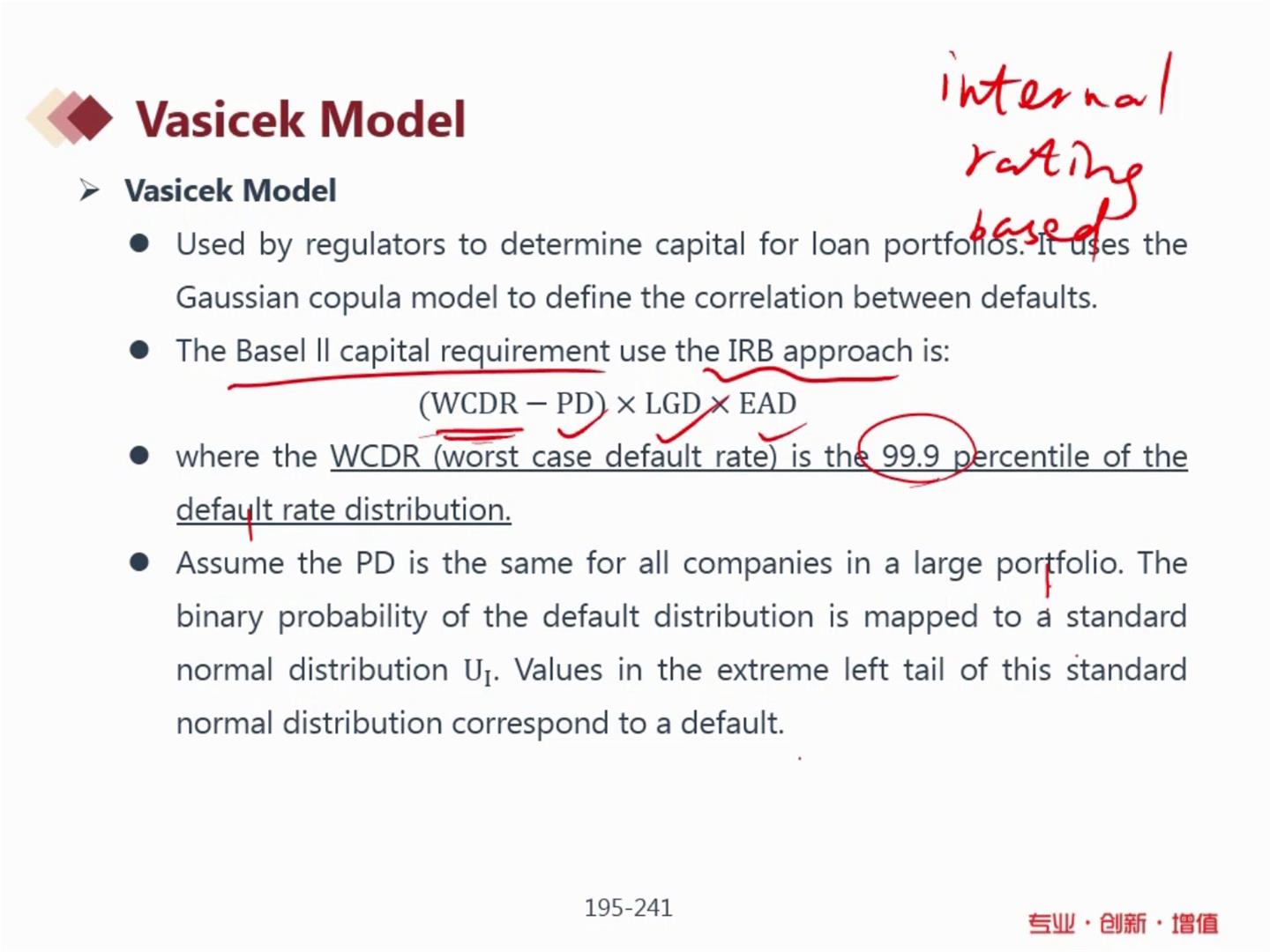 老师刚刚举的例子是99%的概率水平下,分位点是2.33如果U超过了2.33,则说明违约,那为什么这里要查标准正态分布的累计函数呢?公式里0.999的标准正态分布的逆函数求分位点,也是求标准正态分布下的累计函数的分位点吗?那么刚刚为什么要与正态分布的密度函数99%的概率水平下的分位点2.33比较呢?两个用的不是一个函数啊?
