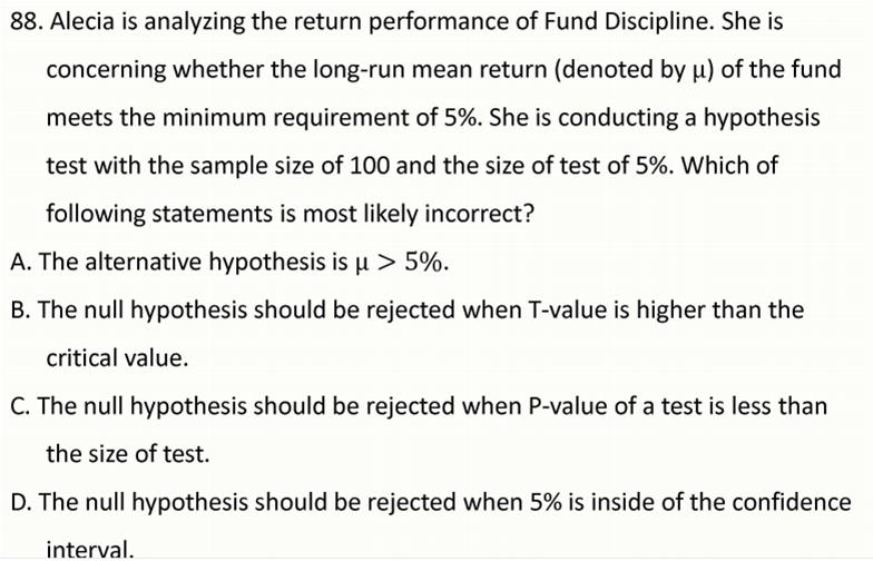 老师辛苦~ 见图中题,问: 1、题中“size of test”是α吗? 2、D选项,拒绝原假设,我知道,是在置信区间外,但我不知道,是什么在置信区间外呢?是α吗?(刚好这题,H0:μ≤5%,α=5%)我就更迷惑了?
