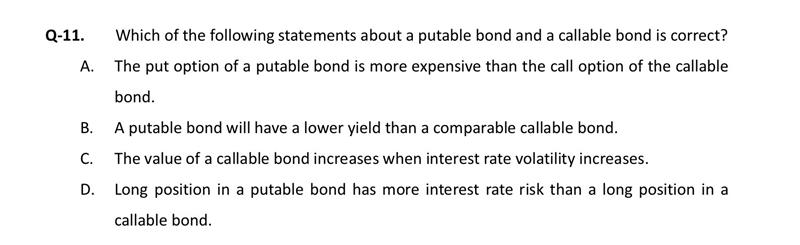 老师 百题第十一题c选项利率的波动率增加 所以看涨期权价值增加 可赎回债券的价值是增加的 为什么c不对呢 发行人角度确实是增加的 投资者角度是减少的 但是选项没说是从发行人还是投资者角度啊 如果把那个Callable改成putable 那利率波动率上升时是不是投资者方putable价值增加呢