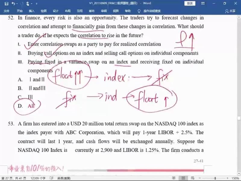 老师,押题52题是不是答案错了?还是课件错了?课件里realized表示是浮动利率,与fixed相对立。押题52题,老梁将realized解释做固定利率,这就刚好相反了啊!还有个问题,第三个选项,fixed本身就是固定的,两个都是当初就定死了的固定利率,怎么套利?应该改成ffloating利率才对吧?看老梁的解释,两个fixed利率都消掉了