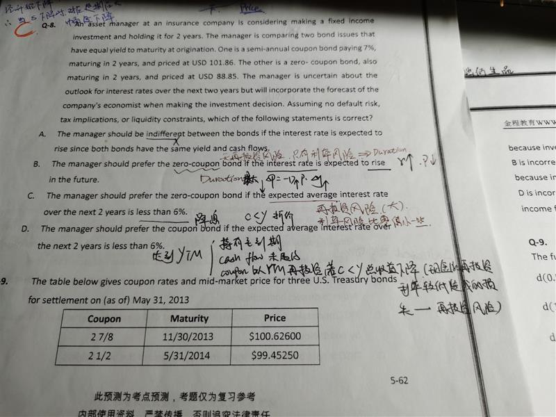 麻烦老师看一下这个题,还有我的疑问,我觉得我说的还是有一些问题,coupon进行再投资这里,利率是一直在变得,所以说以平均利率来看不现实。某一时刻的利率,如果大于或者小于平均利率。对应的coupon再投资收益就会发生改变,如果大于平均利率6%那么在投资收益更高,投资者更倾向于再投资,如果小于平均利率6%,那么投资者宁可不投资,放在银行收取无风险利率,这里和只有利率风险的零息债比较则更倾向于零息
