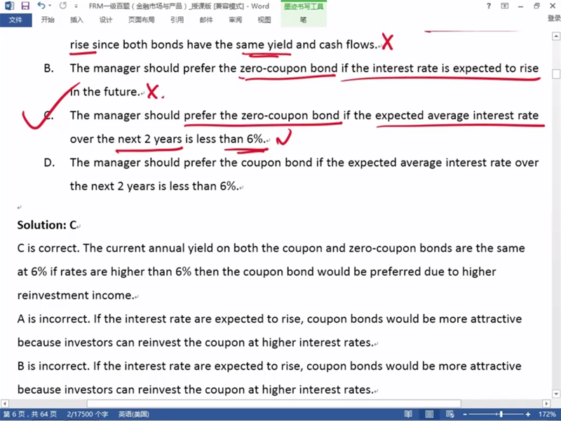 A选项的利率上升,是指semi-annual coupon bond和zero-rate coupon bond的YTM上升吗?为什么会更偏向于coupon bond?A选项说的indifferent是指两个债券之间什么方面无区别?