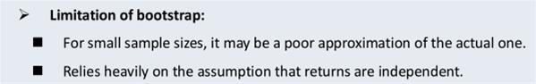 老师好\(^o^)/~ 见图,图说的是脱靴法的2个缺点,我都有疑问: 1、第一个缺点,说,对于小样本,可能不够准确。 可是,我学的是,是由于当前的市场情况与正常市场情况不同,导致不够准确。而不是小样本的原因。 2、第二个缺点,说,可靠性要依赖于假设收益是独立的。 可是,脱靴法,没有任何的假设啊?