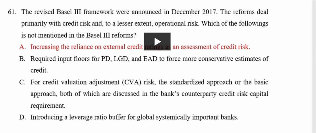 押题61:老师好, 这道题A选项, 老师说BASEL I、II主要依赖的是外部评级, BASEL III是依赖内部评级。 这个是不是说的不对, 信用风险方面, BASEL I 在评估的时候,比较依赖于国家是否属于OECD吧?在BASEL II中,risk weight取决于风险评级?
