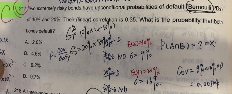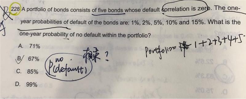 老师您好我想问一下这两个题,他们是一样的题型吗,为什么求组合的expectation或者说probability等于组合里面单个债券的probability或者expectation相乘呢,像是228图(图二)为什么组合的不违约概率不等于单个债券的不违约概率相加呀,为什么是相乘呢?比如说一个组合里有债券x1和债券x2,那么组合就=x1+x2.那E(portfolio)=E(x1)+E(x2)?请问我这个理解有什么问题呢,谢谢老师