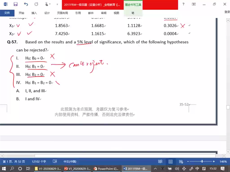 57题把P value和哪个数比较?这是个双边假设,双边是5%,那单边就是2.5%,所以是P value和0.025比较吗