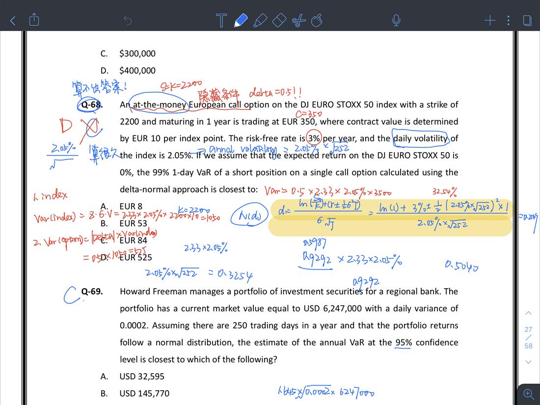 老师你好 这一题先开始看到atm这边联想到delts=0.5 我自己通过d1公式计算,为什么算不出来delta=0.5呢(计算过程描黄了)