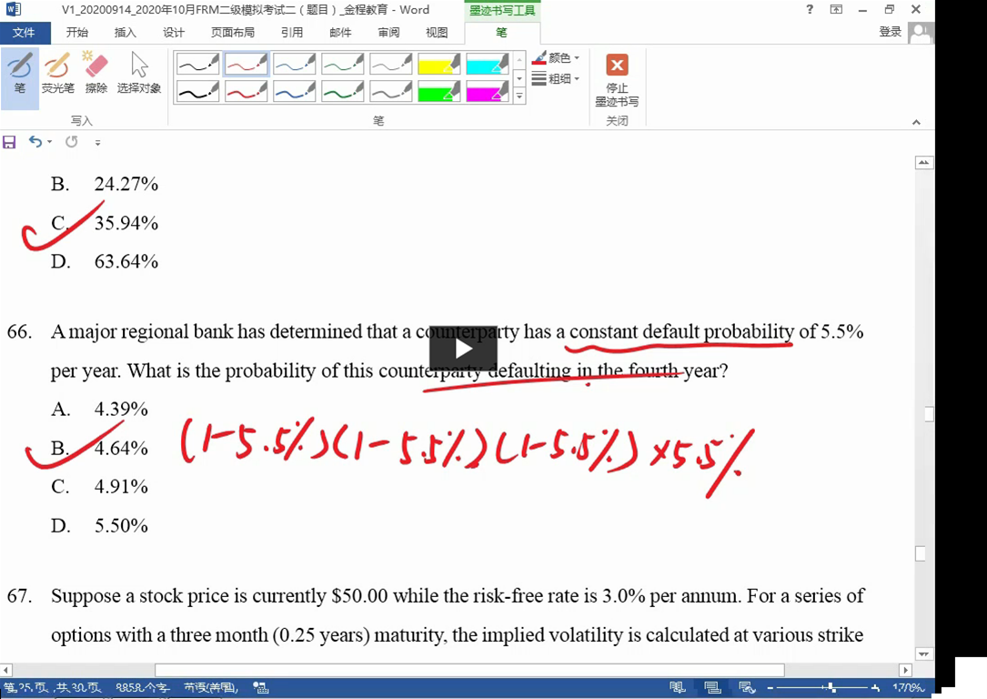老师好,这道题题干中已经说了每年违约概率是固定的5.5%,那第四年违约概率不也应该是5.5%吗?