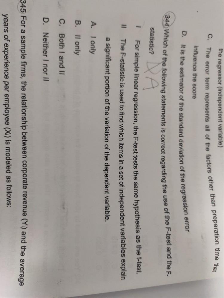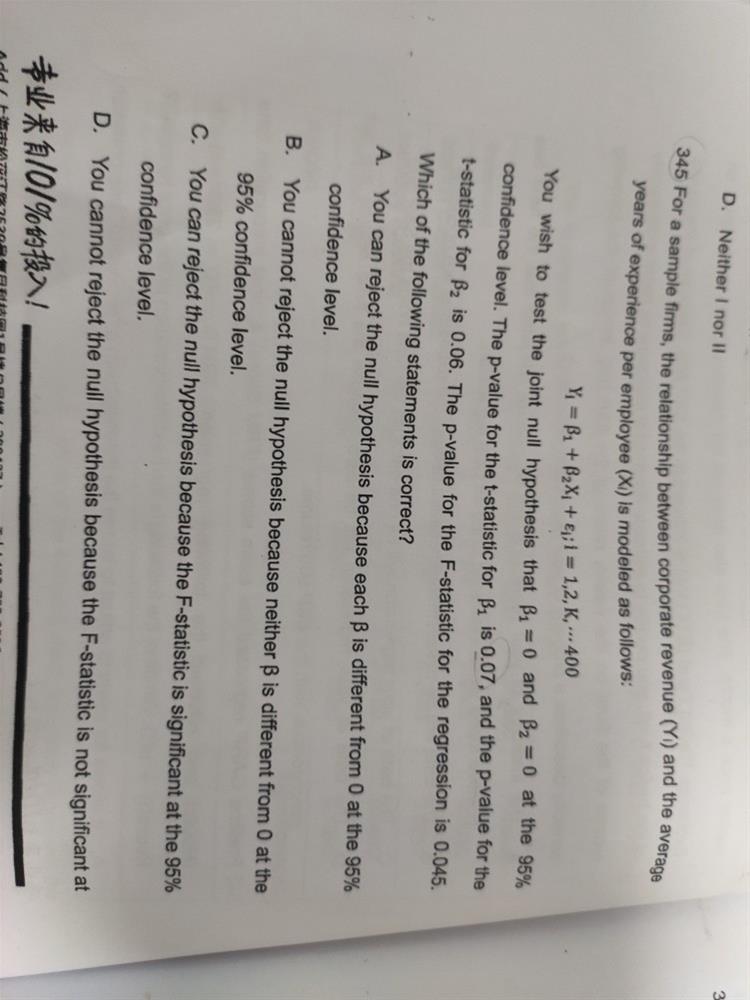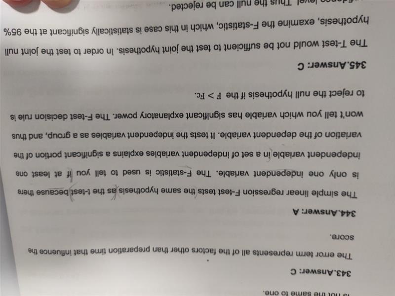 查看试题 已回答老师好,我问的是习题册第345题。我记得。F分布是在多元线性回归。关注的是好多斜率为不为0。也就是至少也得有两个自变量才能够进行f检验吧。我看这个345题里边,它只有一个自变量。就用上的联合假设检验。难道我理解的联合假设检验太窄了吗?希望老师解释一下。老师辛苦了!