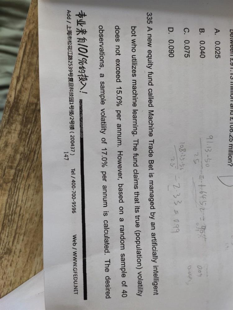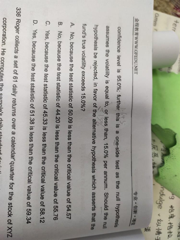 已回答老师好,我问的是新版习题册的第335题。这道题这是从哪里看出来,它是需要一个卡方检验统计量?并且需要根据卡方表来找关键值?而且找关键时的时候,我翻看的是2019年的Notes发现后面这个附表里边并没有自由度为39对应的概率,这道题是不是也超纲?
