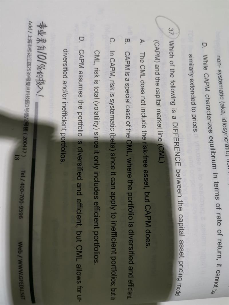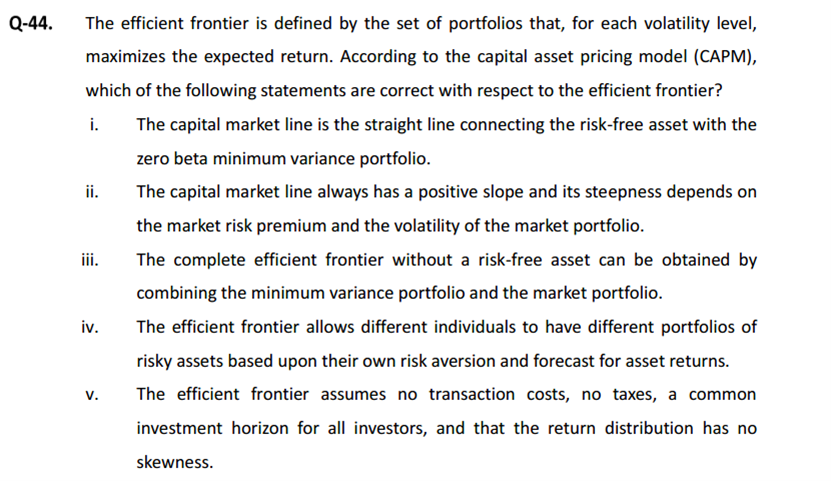 问:iii选项 1、什么叫 complete efficient frontier,跟我们学的,马克茨维的有效前沿,是不是一回事? 2、马克茨维的有效前沿,就是不包括无风险资产啊,怎么这个选项中,还说要,去除无风险资产,我迷惑了?