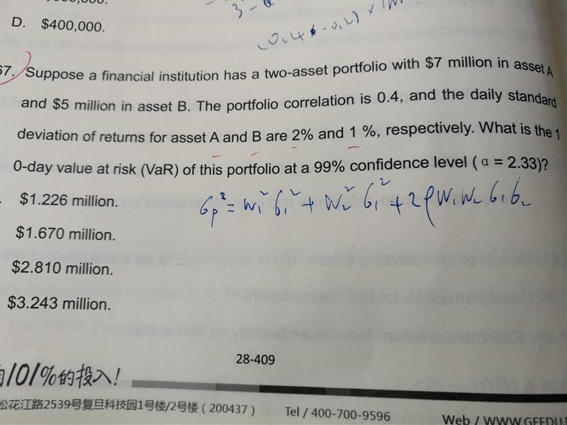 67题,我用我写的公式算出的组合的标准差是13.87%,而答案用矩阵算的值是16.64%,为什么会不一样?另外,答案里红笔划出的两个值是怎么算出来的?