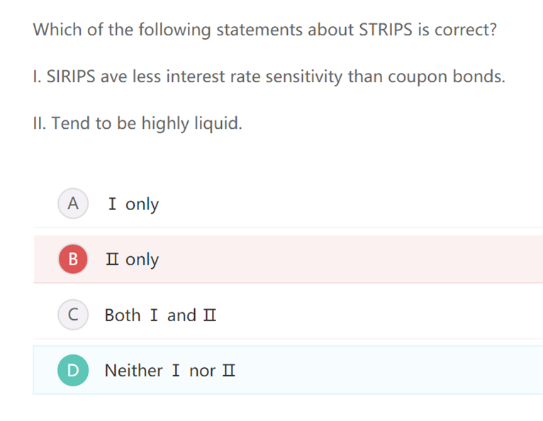老师,这题讲解是说strips因为是零息债,所以duration大于coupon bond ,但是strips不是拆成 P-STRIPS 和 C-STRIPS吗,这两个如果光算P-STRIPS确实是duration大了,但是如果组合起来不是和原来一样吗?