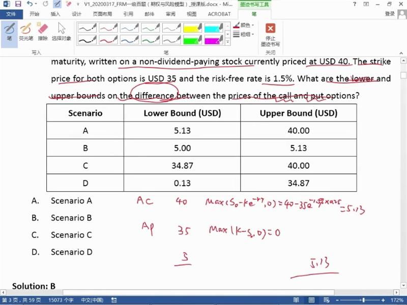 这个第二题考的东西我明白是期权的上下限,但问题我觉得问的有点奇怪。他问的是两个期权上下限的差值,两个期权上限减上限的差值应该是5,下限减下限的差值应该是5.13。和选项相反,如果问的是差值的上下限的话,答案也不对。
