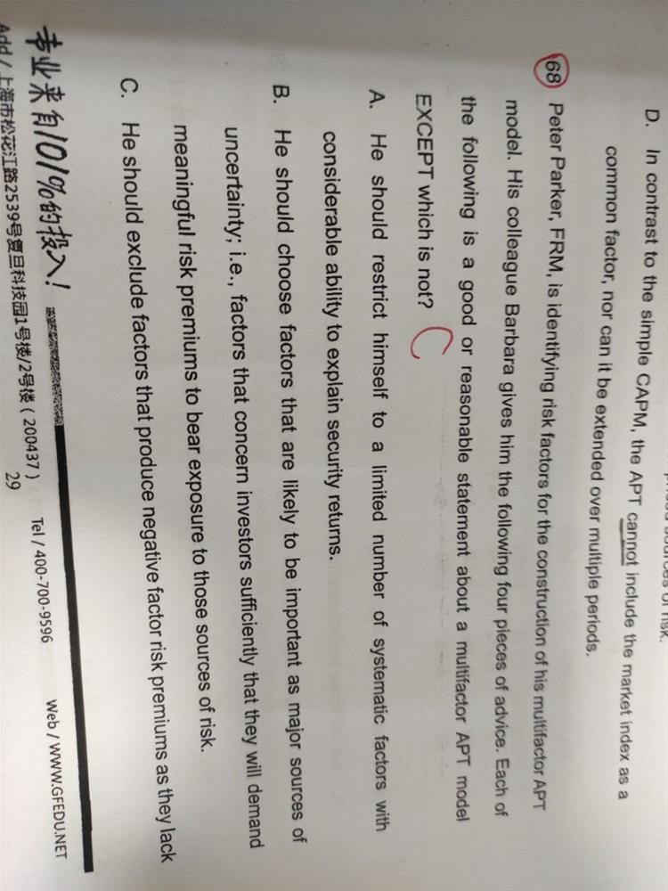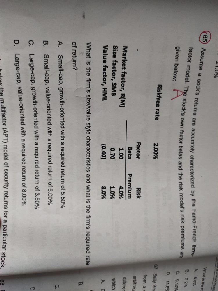 老师,我又有3个问题,n第一是不是带括号都是表示负号,考试的时候也是这样吗?第二紧接着这个题里面 small--cap,large--cap是什么?n第三如何从这个题里面判断是成长型还是价值型?一般book-to- market ratio越高是价值型,越低是成长型,HML是高减低,也就是价值型减去成长型,是不是HML>0就是价值型,反之,HML<0就是成长型,这样理解对吗?
