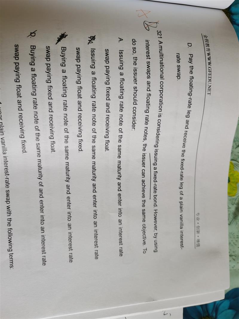 请老师解释一下这个题,我的理解是这个题他是因为发行了一个固定利率债券就是付固定,收浮动。所以应该在发行一个浮动利率债券来进行抵消,c.d因为是买浮动,所以就是付固定收浮动和发行一个固定债券的意义是一样的,所以不能抵消。但是后面为什么要附固定收浮动,这里不是很能理解