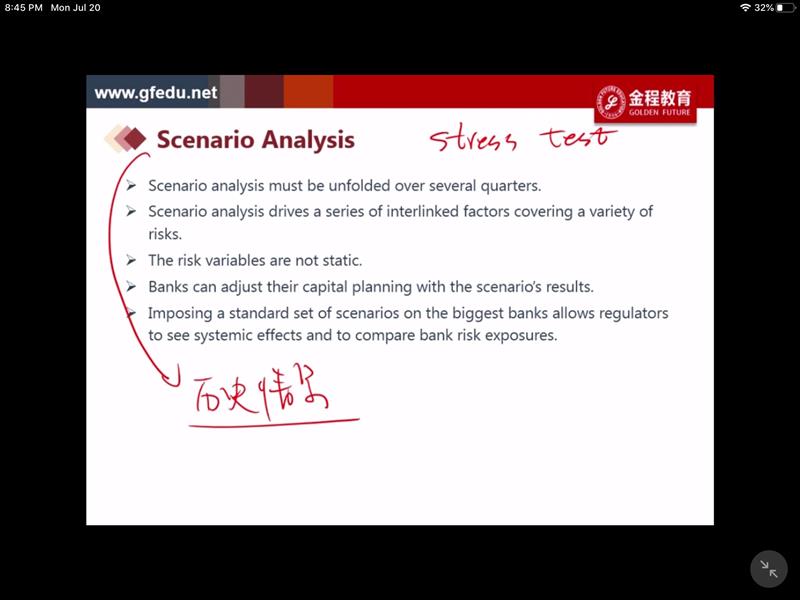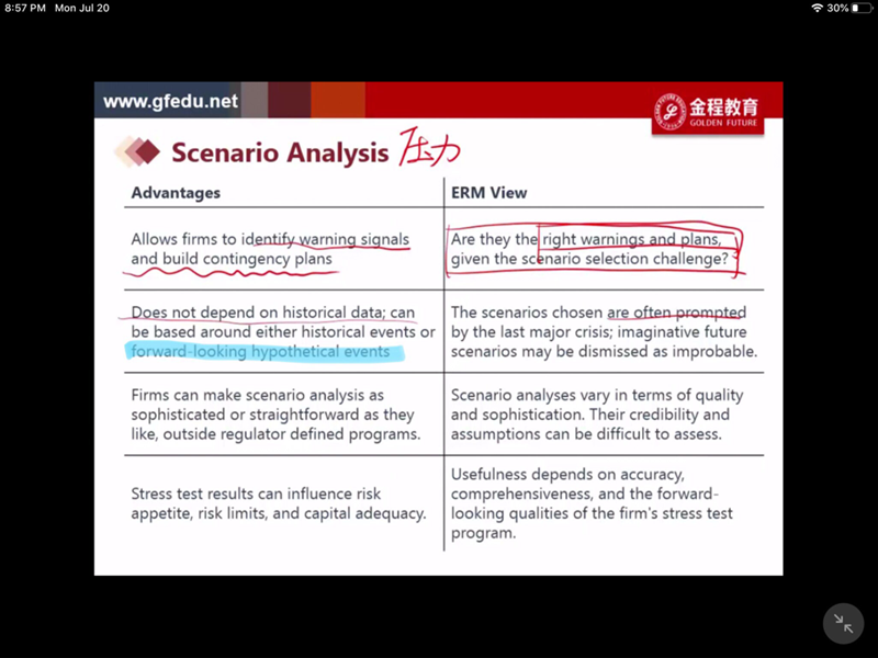 老师 不好意思 100 知识点无法提问 所以在此提问了 100 知识点那个老师 has emphasized multiple times that scenario analysis 只可以用历史事件做情景分析,要和 stress test 区分开,而 stress test 才可以用假设性情景去模拟... although this doesn’t make any sense to me, also, there is nowhere we have mentioned about stress test analysis in this course yet... 图二蓝色 highlight 部分under SCENARIO analysis 也说的是 “historical events OR forward-looking hypothetical events...” 假设考试就是问到我 “scenario analysis 哪个选项不对”, 我还是需要求证一下 scenario analysis 到底可不可以用假设情景呢?