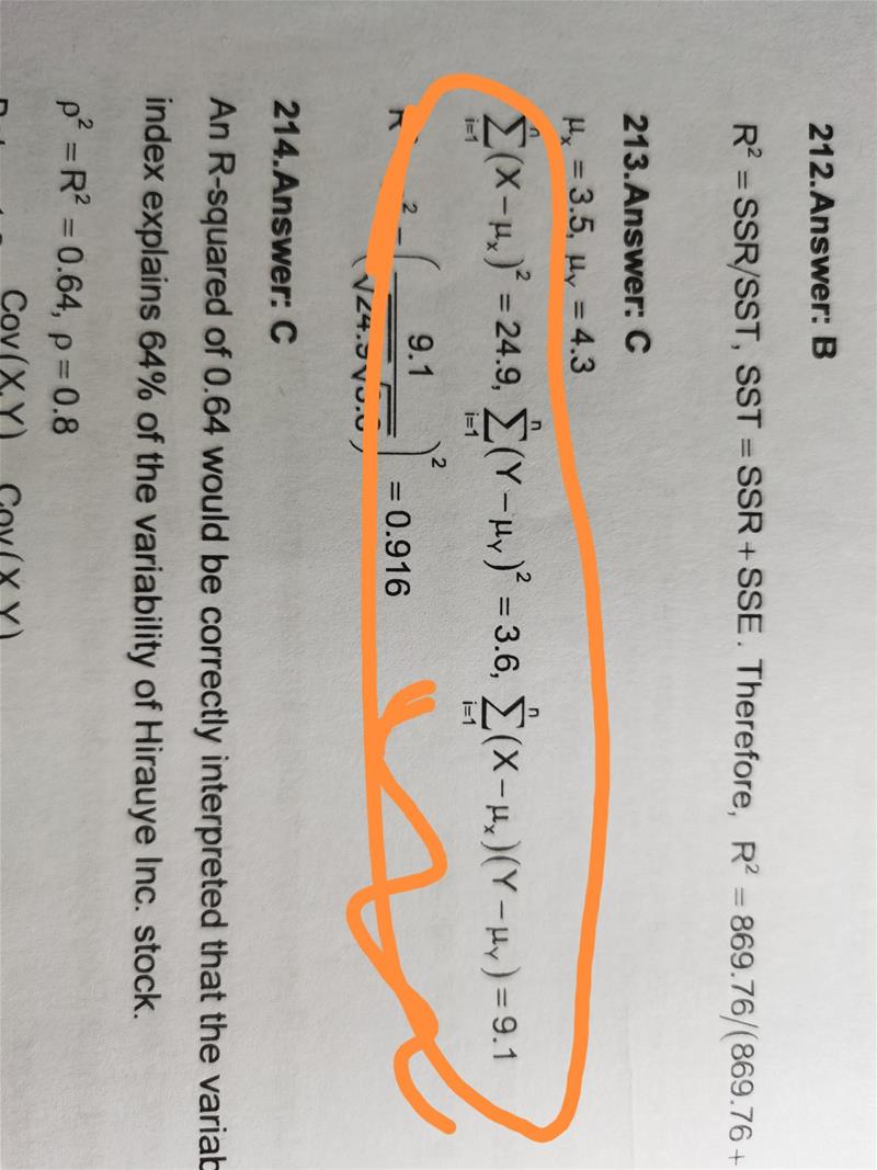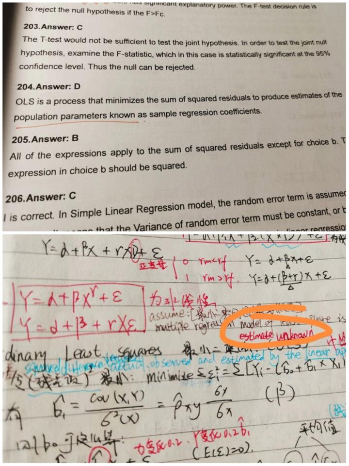 请老师解释一下,201题这四个选项的意思以及答案的意思。204题答案上写的是总体参数已知,但是我在笔记上记了一个估计量未知,不太明白什么意思,可能是之间做的笔记但不是很详细忘记了这里知识点,麻烦老师再说一下。还有最后这个,X和y求期望,算出了x和y的平方差之和以后怎么一起求得期望?我是给24.9和3.6分别开根,然后相乘,但是算出来的答案是9.4