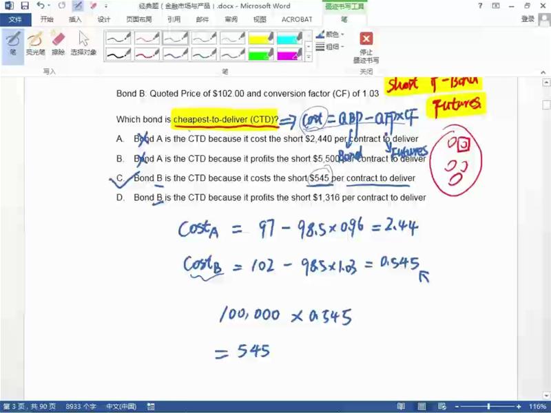 这里算出成本是0.545,老师说长期国债期货合约是10万份,所以最终成本是0.545/100(面值是100份)×100000=545