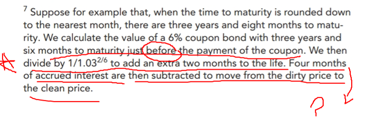 请问老师怎么理解4 months of accrued int are subtracted? 为什么不是2 months呢?还有为什么是带了上一期的coupon进行discount 呢?谢谢
