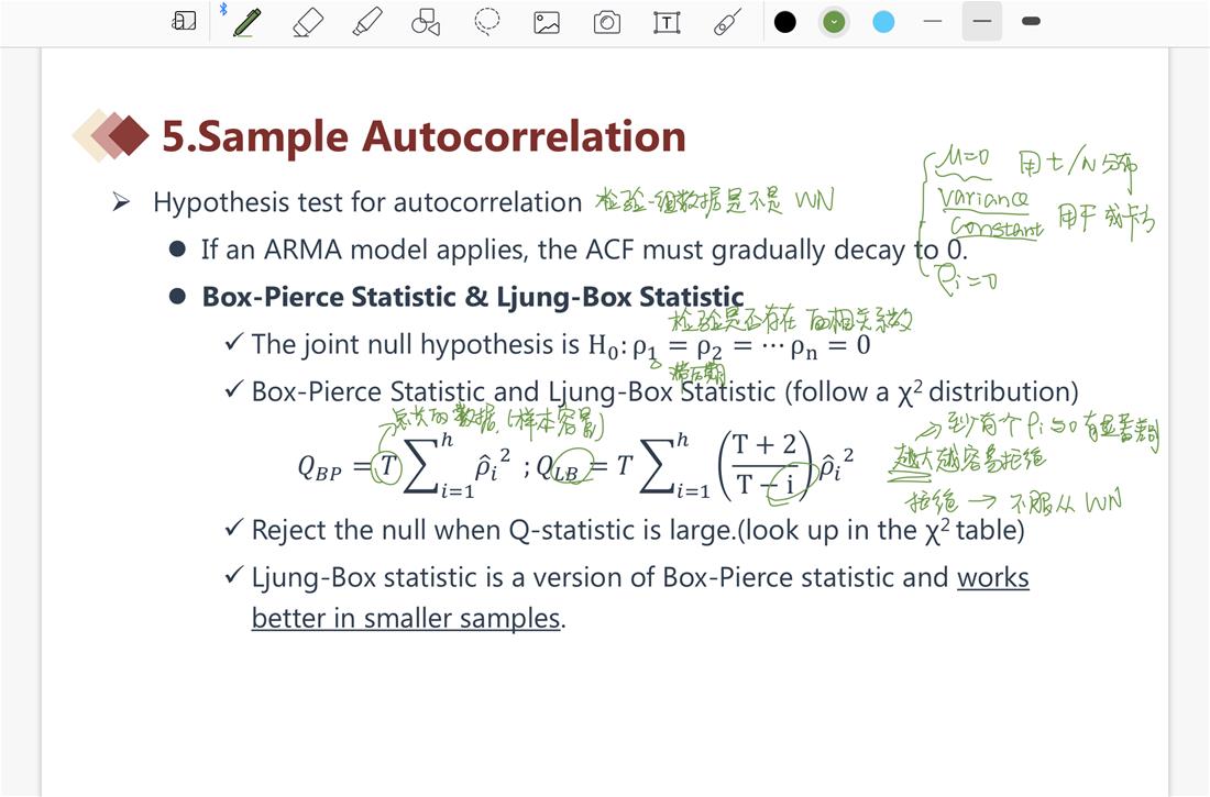 老师你好 这页讲义的正文第一句话“if an ARMA model applies, the ACF must gradually decay to 0" 我有些疑惑 为什么要放在这边 上课老师讲解的时候说 这个假设是用来检验相关系数是否等于0,就是是否服从白噪声分布,放这句话if an ARMA model applies, the ACF must gradually decay to 0" 是因为这个检验和这些模型是否能使用也有一定的关系吗?服从白噪声分布就能是用AR,MA和ARMA吗?