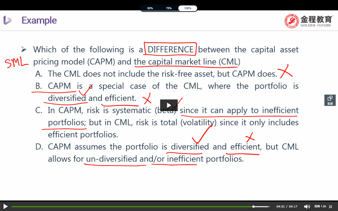 老师想问一下,为什么A说beta为0错了,cml公式里确实没有beta啊,而且为什么说Beta为1。C的话为什么在那个点上的时候就是minimun的方差。