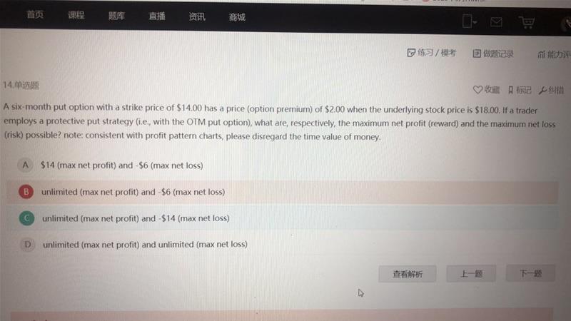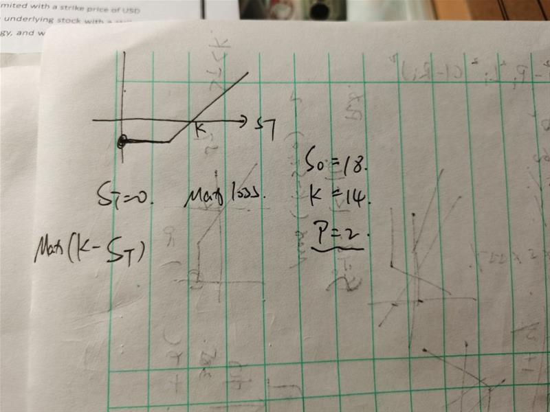请问老师,这个最大损失是怎么计算的?当股价为零时,损失最大,所以算得14。但是(St+p)说明看跌期权是买入,那不是还有期权费要减掉吗?所以我觉得最大损失应该是16。或者说这个题是按照pay off计算的?