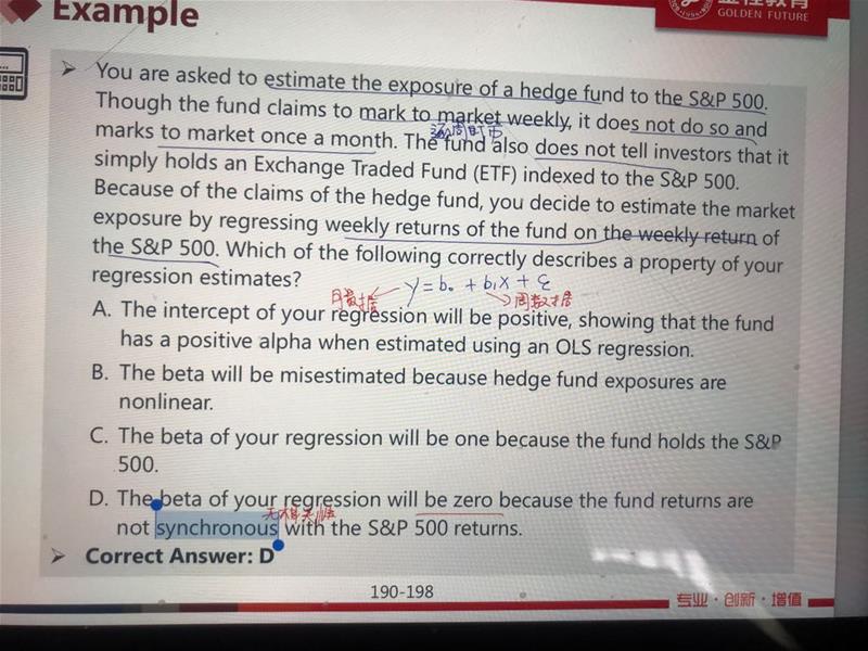 这一题的D选项我不太懂 题目说了是把基金利润和标普500利润做回归 而且基金指数是和标普500挂钩的 为什么会没有相关性即beta=0