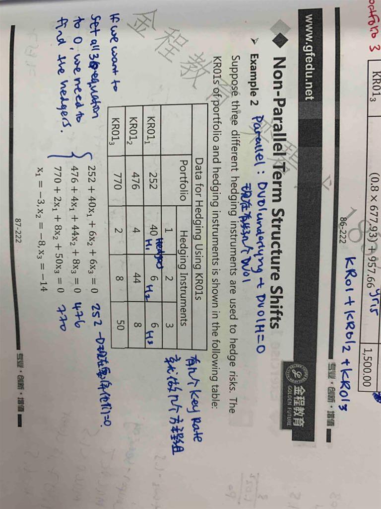 老师 我想问实际考试做 KR01 hedging 的时候一般是给到什么样的数值去做 因为如果按这种数字 3个方程组来做的话 耗时太长 不太划算的样子 是否可以直接放弃 又或者说老师有没有比我这个笨办法更简单更快的算法呢 有的话麻烦老师教教我