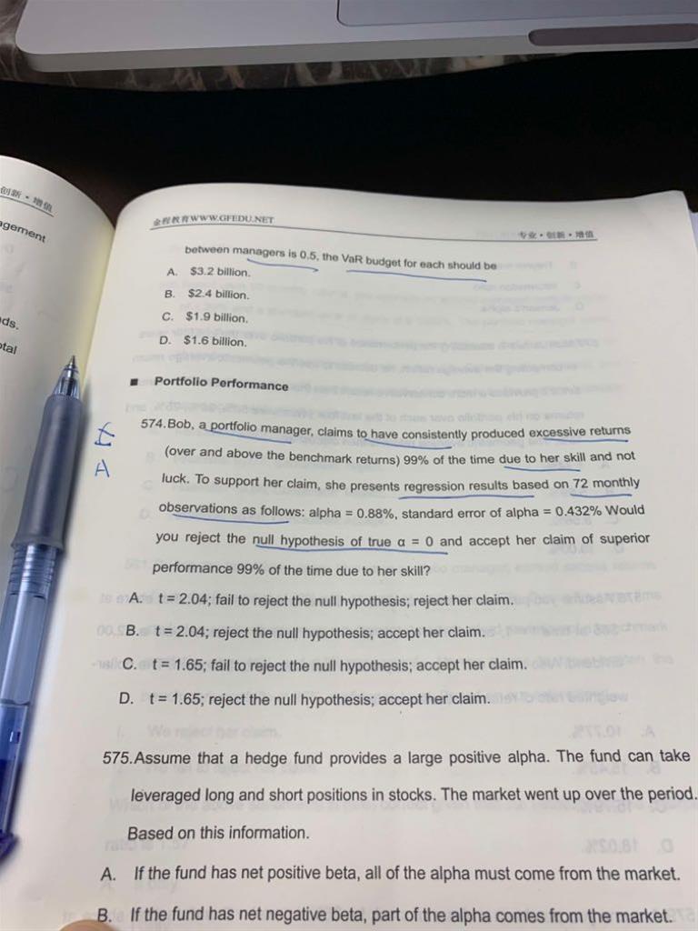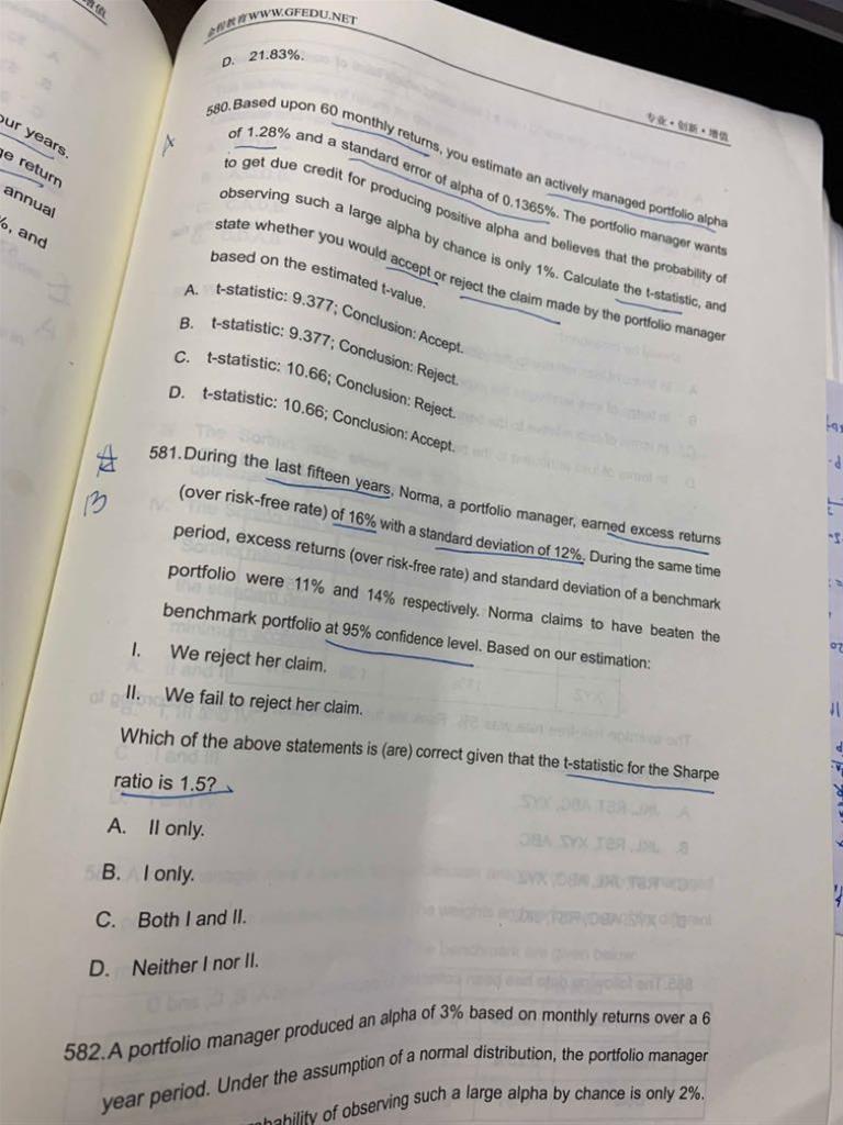 习题581:老师好,这道题,I 是reject claim应该选这个吧?claim不是beaten了benchmark portfolio吗,这里t=1.5小于1.96,应该是没有落在拒绝域,所以I是对的吧?