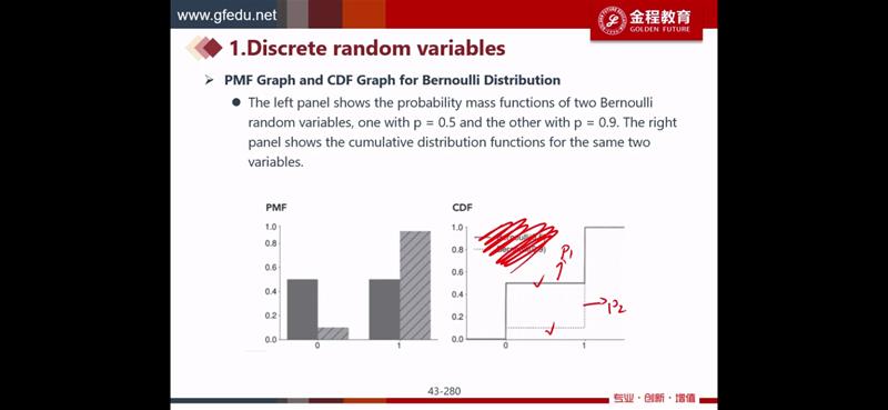 在CDF中,x取0,F(x小于等于0)对应虚线在Y轴取值为0,老师为啥说是0.1呢 另外怎么看出来P2大于P1呢