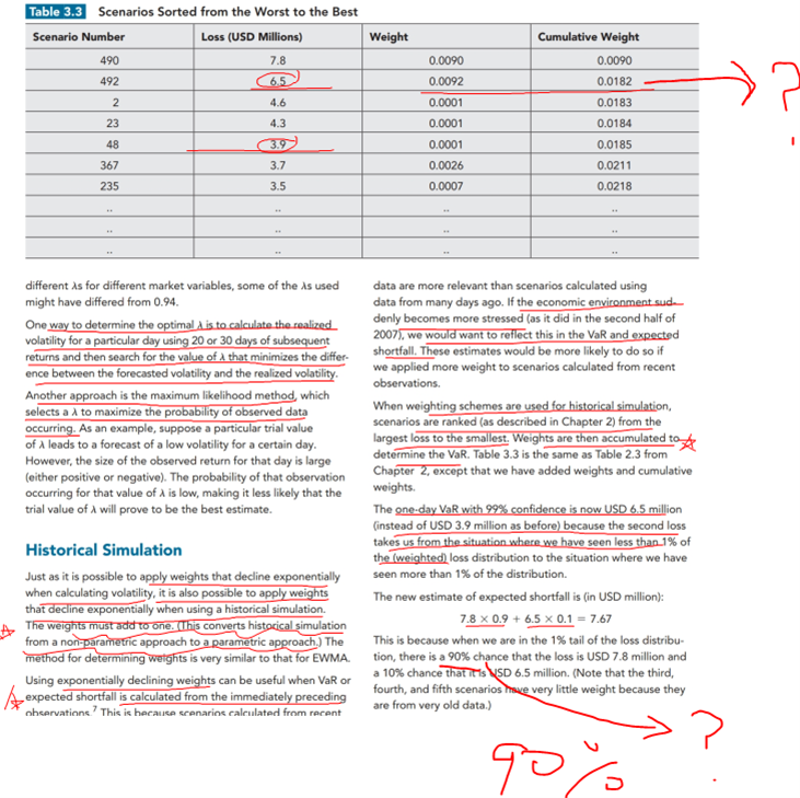 请问90%这个数值怎么来的?还有用exp declining weights这个方法,表格中的cumulative weight 是表示概率吗?比如492这个数据,它的cumulative weight是0.0182,表示1.82%吗?那99%的为什么没有插值计算呢?谢谢