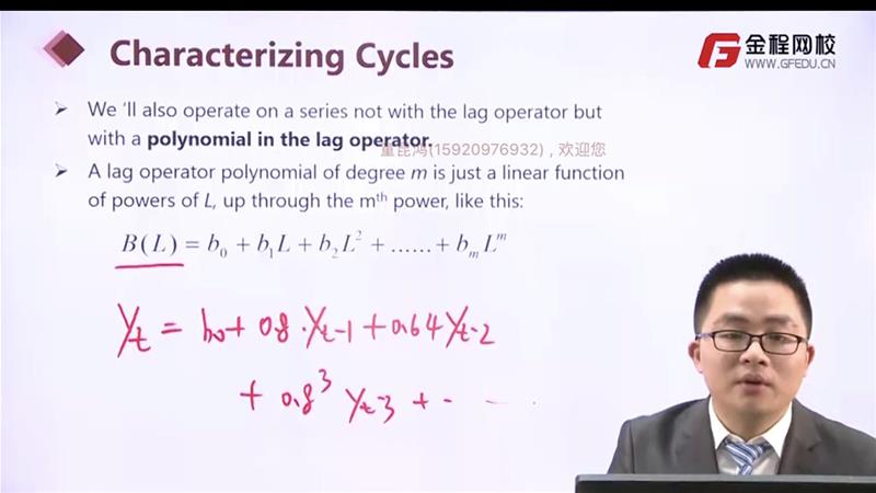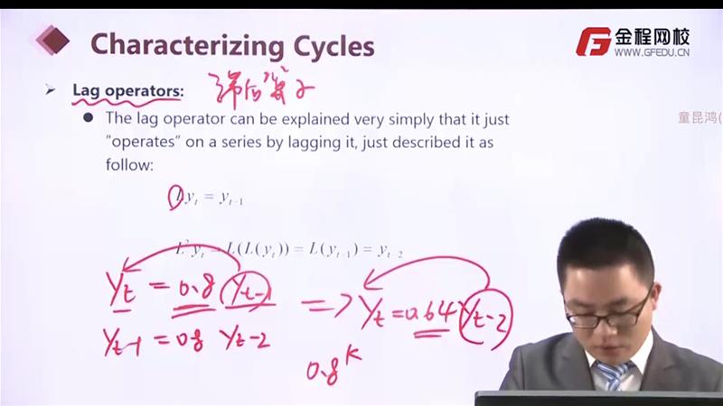 老师您好,滞后算子中的举例是y(t)=0.8y(t-1)=0.64y(t-2)...,为什么后面又说滞后算子的展开式是y(t)=0.8y(t-1)+0.64y(t-2)...呢,这样相加不是n个y(t)了吗