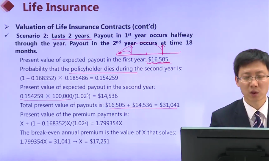 老师,这道例一算保费的题,第二年保费的计算为什么不是直接除以1+2%,而是除以(1+2%/2)2呢?保费是在年初付呀?又不是赔付,为什么要用除以2折现呢?谢谢指导。